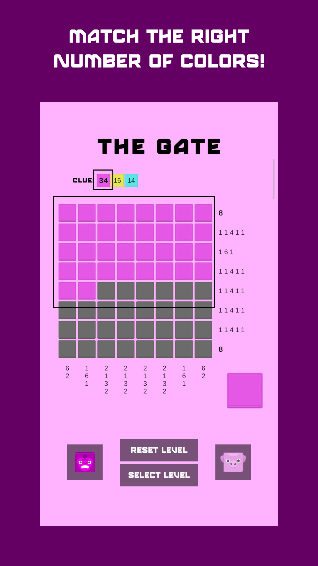 Buttons 2: Gorilla & Pig is a color nonogram word puzzle where every level hides a secret color grid. Use simple logic and just two buttons — Gorilla and Pig — to solve each colorful mystery.